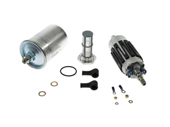 - Electric fuel pump replacement kit with fuel tank strainer and in-line fuel filter for Mercedes W116, W123, W107, and R107 chassis vehicles with single in-line fuel pump