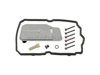 This brand contains: (Qty.) (1) Filter, (1) Pan Gasket, (6) Transmission Pan Bolts, (1) Overflow Pipe, (1) Drain Plug, and (1) Drain Plug Seal.